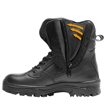 • Collarín de piel flor hidrofugada transpirable y almohadillado que aporta gran sujeción y protección del tobillo con marcado AN. Sistema de cierre mediante cordones de máxima resistencia.