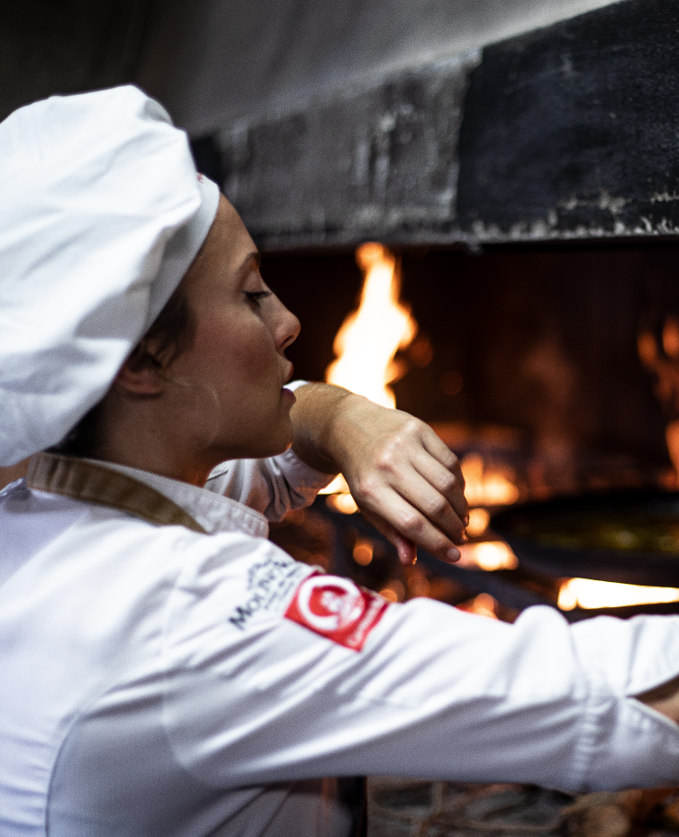 La lumbre de la cocina de Noelia se alimenta con sarmiento, el mismo combustible que ya utilizaba su abuela cuando estaba a los mandos de los mismos fogones que maneja ella hoy. Le conocen en su sector como la chef del fuego, un apelativo que lleva con orgullo porque no le importa exponerse a las altas temperaturas que siente cuando prepara alguno de sus arroces. Hacer feliz a los demás a través del paladar es su objetivo diario.