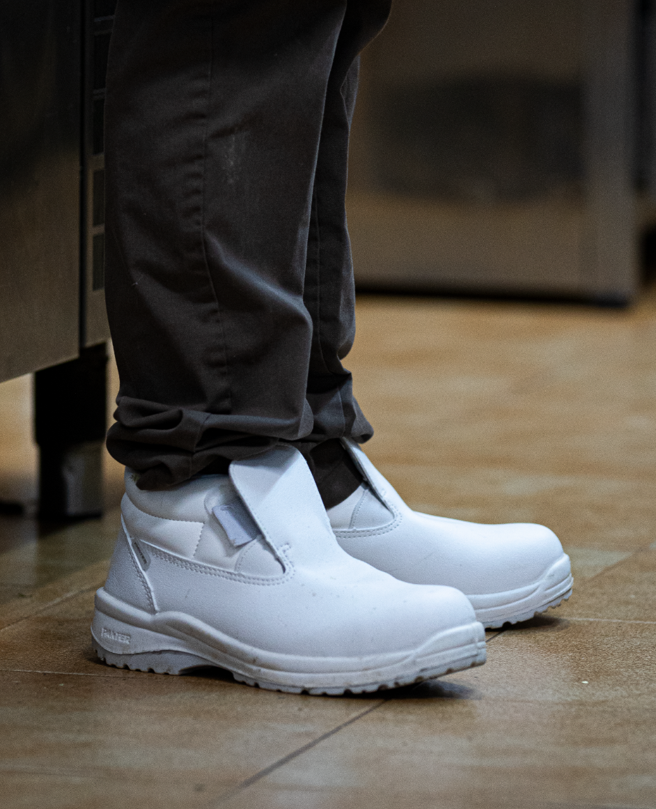 Bota en microfibra blanca, antimicrobiana, ergonómica y con cierre auto ajustable. Espacialmente destinada a su uso por la industria alimentaria, limpieza, laboratorios, sanitario, etc.