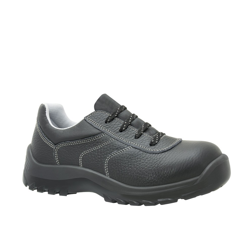 Zapato de seguridad económico y de máximo rendimiento. Indicado para ambientes cálidos. Incorpora perforaciones laterales que favorecen la aireación del pie. Cumple con la normativa técnica sobre calzado de seguridad y los controles de calidad más exigentes.