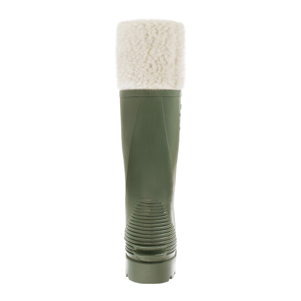 Hoge laars van groen PVC met steunbiedende stof en antislipzool.