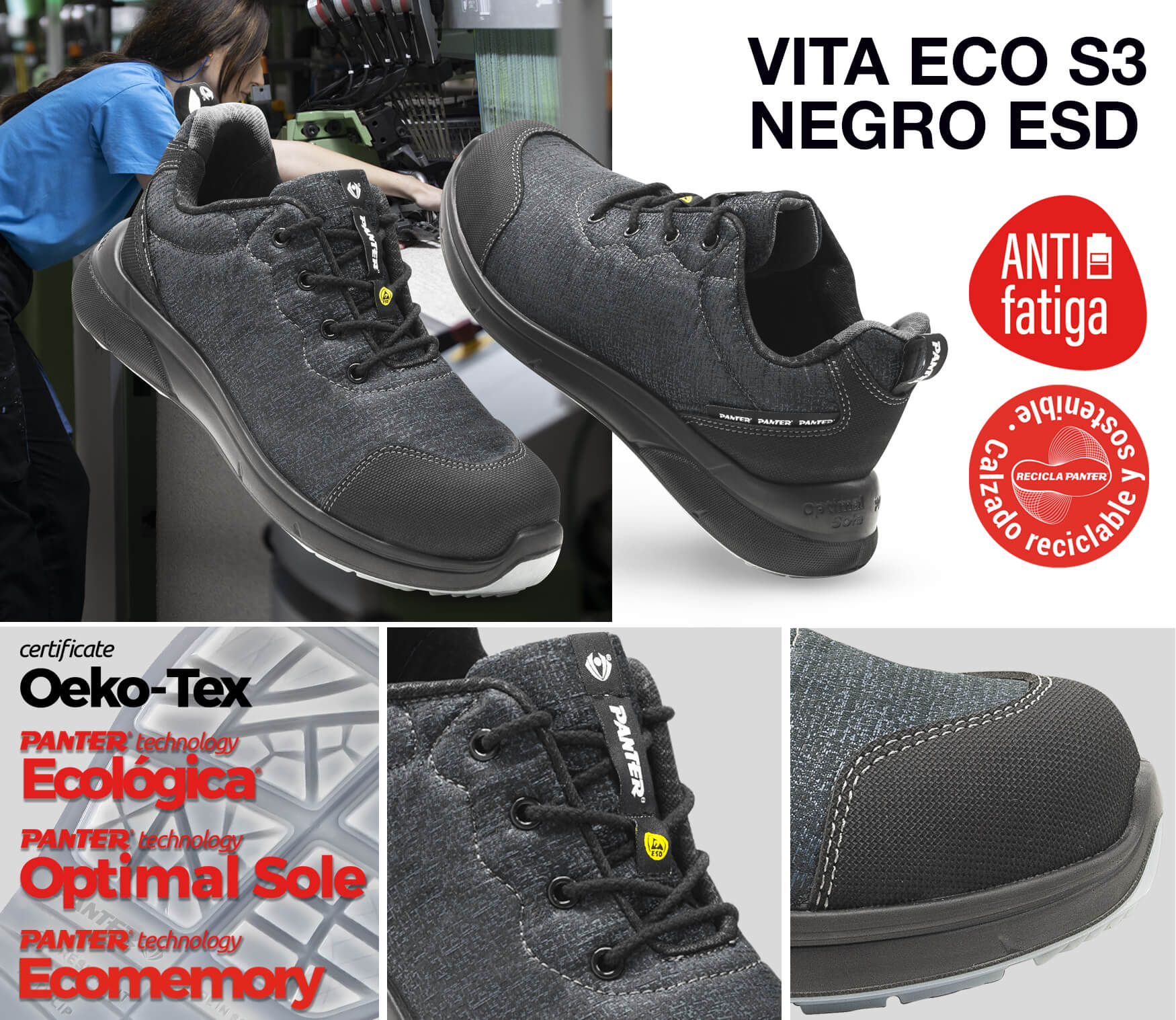 Obuwie wykonane z lekkich i odpornych na zużycie materiałów pochodzących z recyklingu, które zapewniają doskonałe dopasowanie do stopy, amortyzację i odporność na poślizg. VÍDEO - MODELOS VITA ECO S3 ESD    |    VÍDEO - NUEVA LÍNEA ECO    |    VÍDEO - CONFORT Y FUNCTIONAL